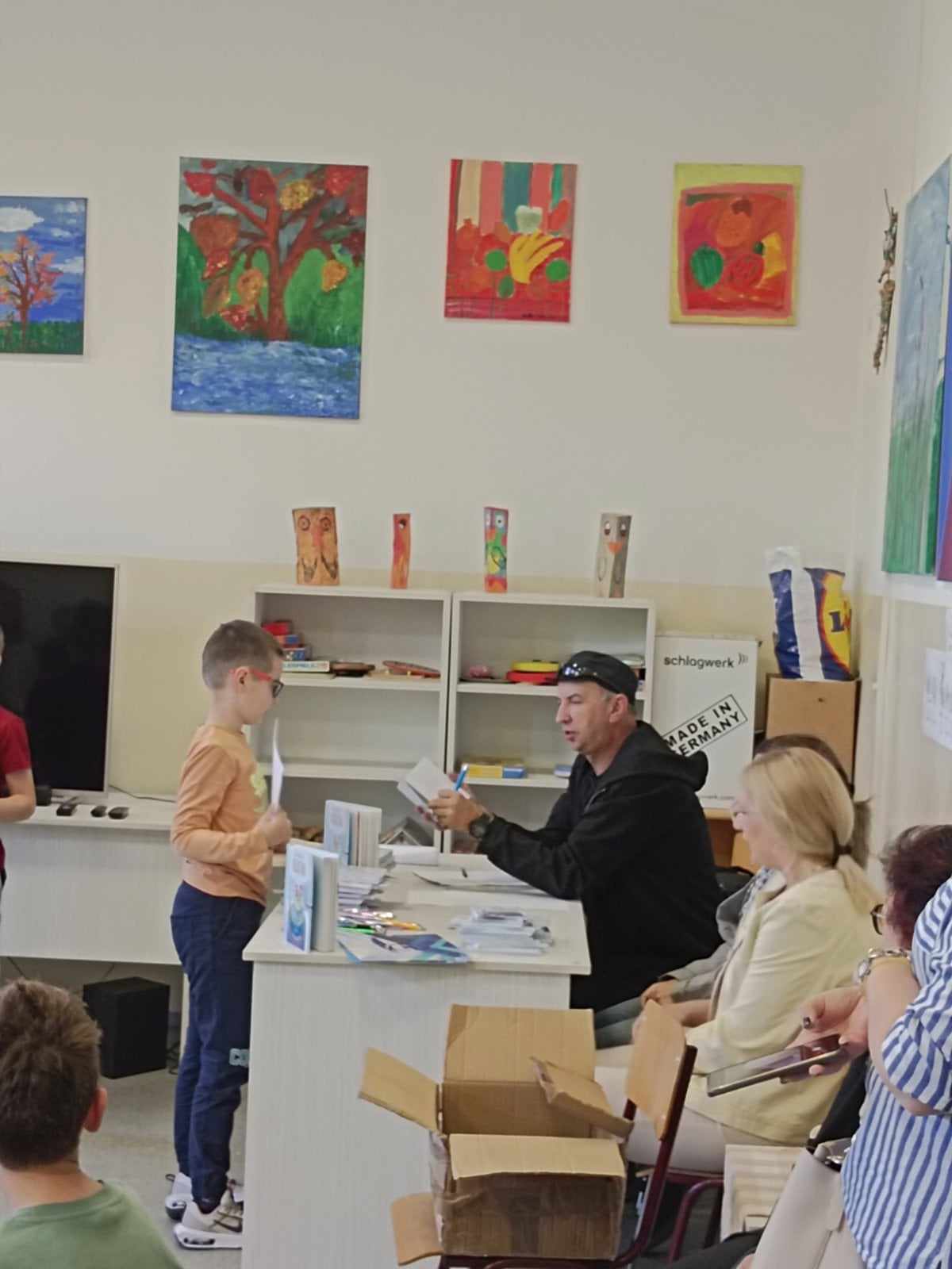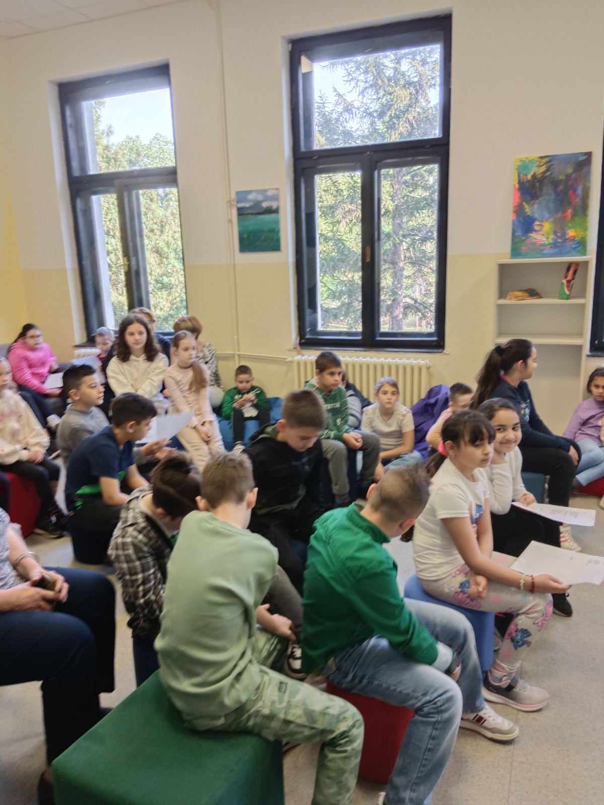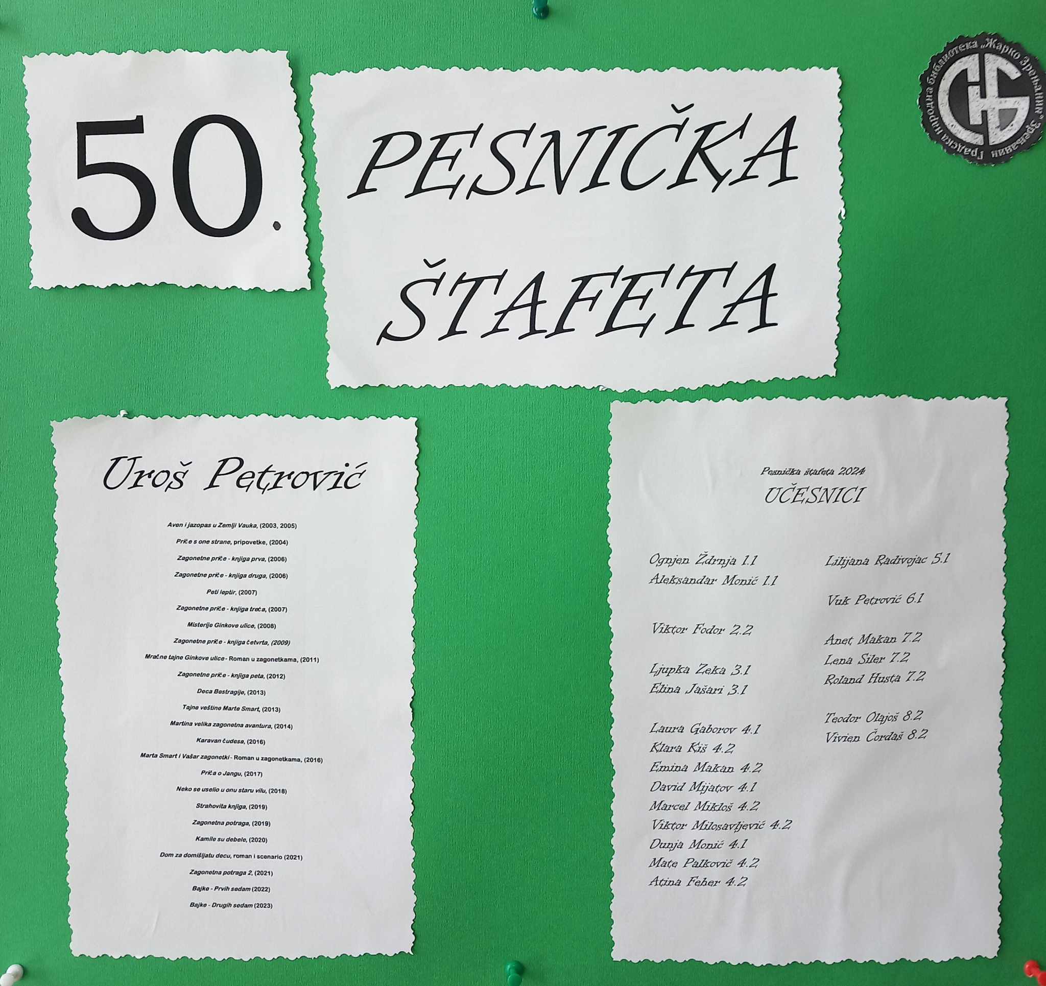 Велика и важна манифестација, „Песничка штафета“, коју од 1975. организује Градска народна библиотека „Жарко Зрењанин“, ове године слави јубиларну, педесету годишњицу постојања. Многи су песници и писци претходних деценија предводили зрењанински песнички караван, а ове године част је припала Урошу Петровићу, који је за специјалну прилику уредио књигу „Педесетица“, у којој се нашао његов избор песама свих песника и песникиња који су од почетака манифестације до данас били њени гости – водитељи. Наша школа сваке године учествује у овом дружењу, па смо тако ове године са двадесет и једном лепом песмом дочекали библиотекаре и госта-домаћина, писца Уроша Петровића, који нас је обрадовао њему својственим загонеткама.