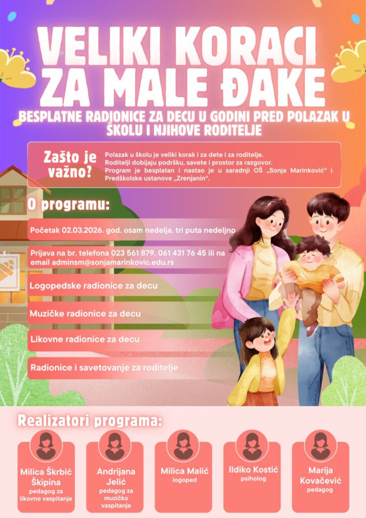 „Veliki koraci za male đake“ je besplatan program podrške deci u godini pred polazak u prvi razred i njihovim roditeljima. Program je osmišljen sa ciljem da deci olakša prelazak iz predškolskog u školski sistem, a roditeljima pruži potrebne informacije, podršku i smernice tokom ovog važnog životnog perioda.